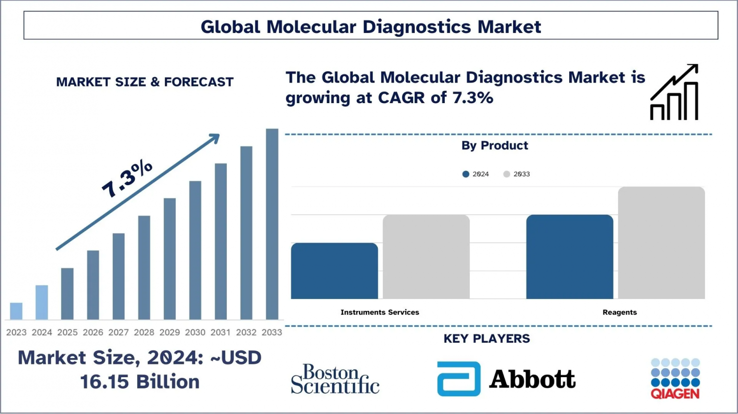The Molecular Diagnostics Market was valued at USD 16.15 billion in 2024 and is projected to reach USD million by 2033, growing at a steady CAGR of 7.3% during the forecast period (2025–2033). Molecular diagnostics (MDx) refers to advanced diagnostic techniques used to detect genomic and molecular-level variations, enabling accurate disease detection, diagnosis, classification, prognosis, and therapy monitoring.