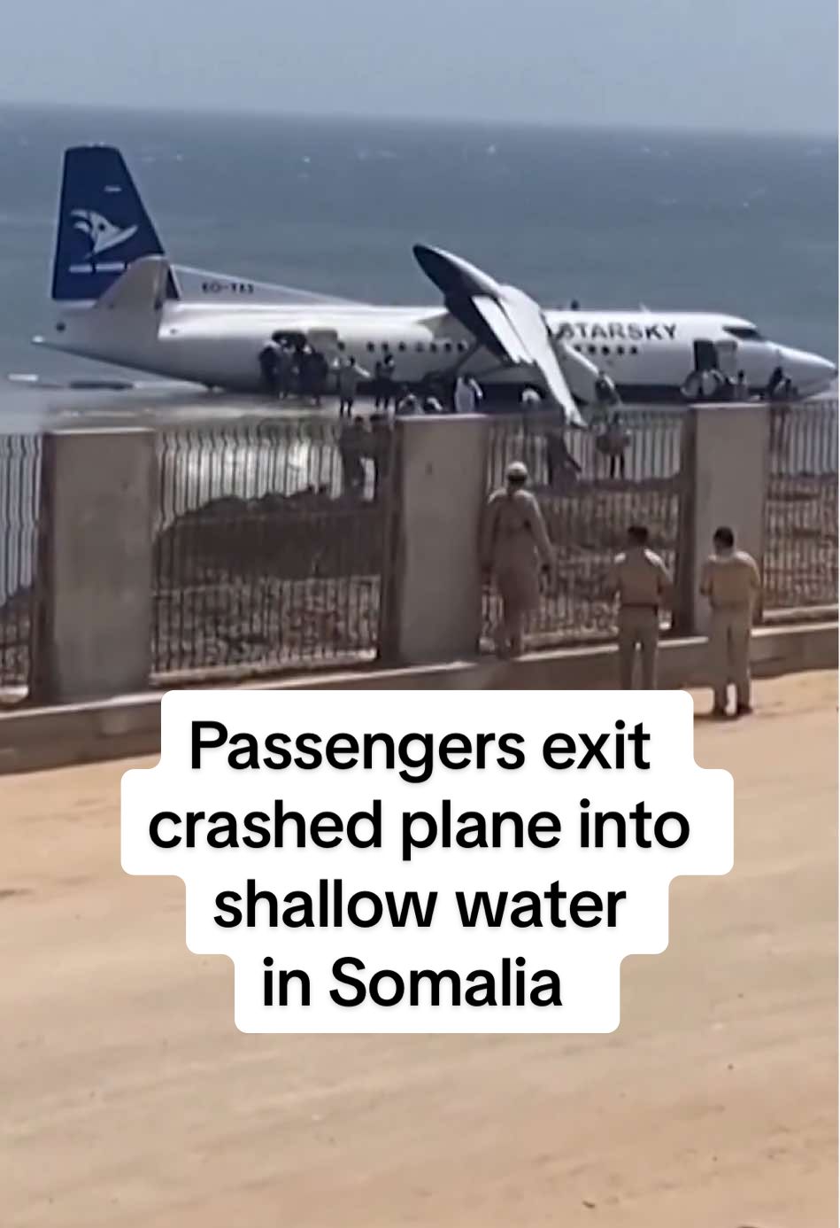 Passengers exited a crashed Fokker 50 aircraft along the shoreline of Somalia’s capital on February 10 after the plane developed a technical problem shortly after takeoff. All 55 passengers and crew survived and were evaluated at a nearby hospital, Somalia’s Civil Aviation Authority said. #somalia #planecrash #emergencylanding #passengers #aviation