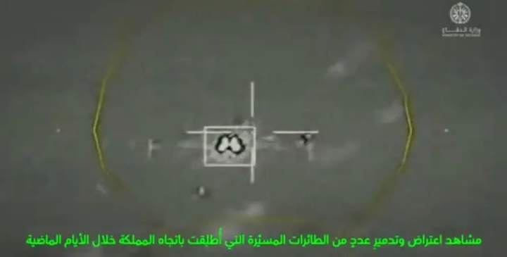 Screenshot of video of Saudi Arabia’s Air Force intercepts Iranian drones over Saudi airspace. Photo: Saudi Defense Minist...