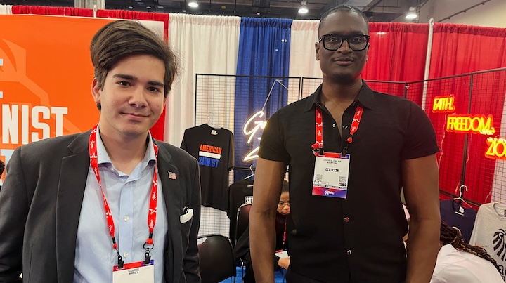 Gabriel Khuly, 19, and Joshua-Caleb Barton, 31, pose for a picture outside Generation Zion’s booth at the Conservati...