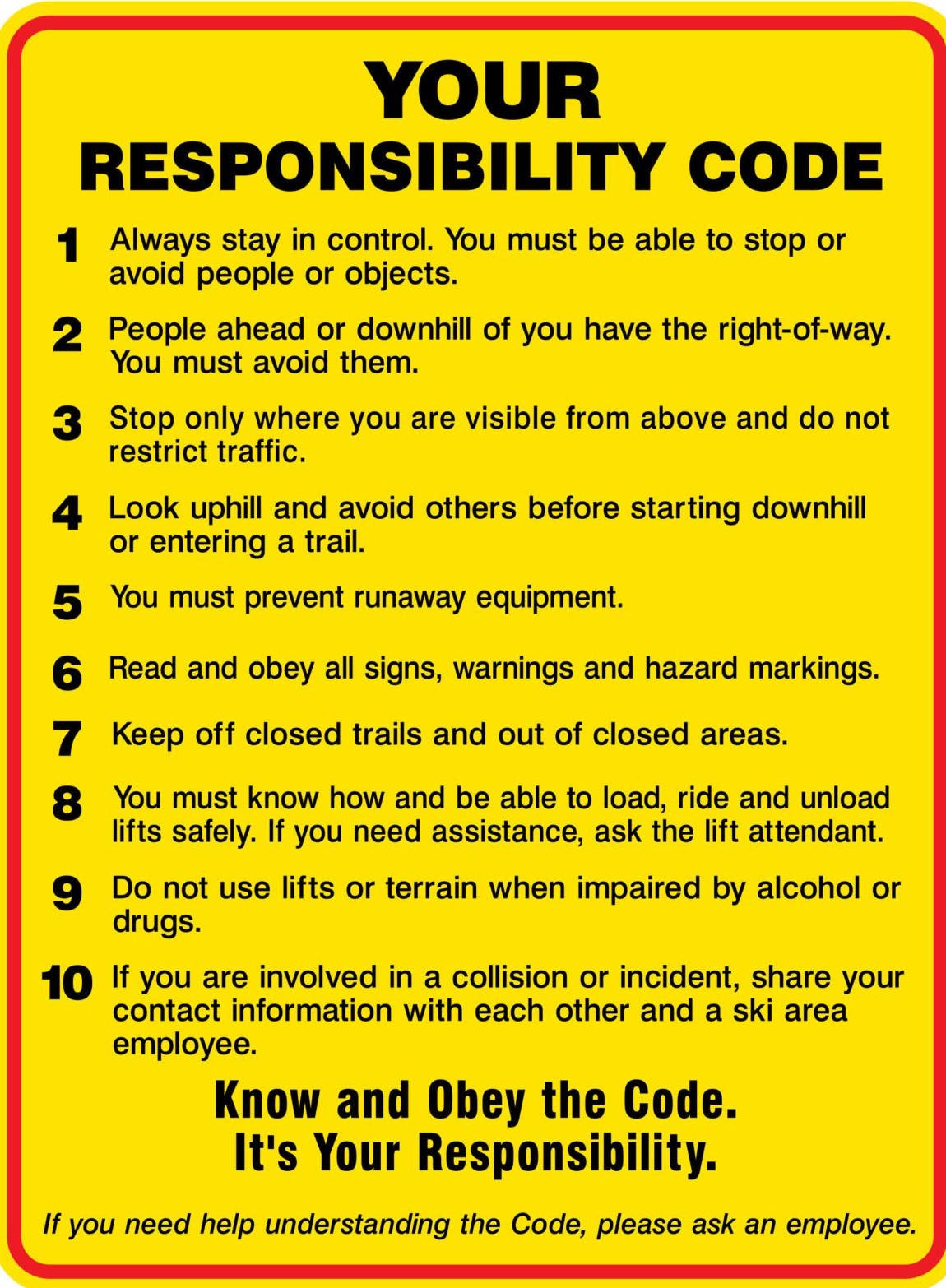 6. Read and obey all signs, warnings, and hazard markings.Interpretation: Please show me the placard saying it’s OK to become a ski slope vigilante and dole out justice to the local hot-dogger just because he ran over your tips. Oh, there isn’t one? Great—don’t do it, buddy.
