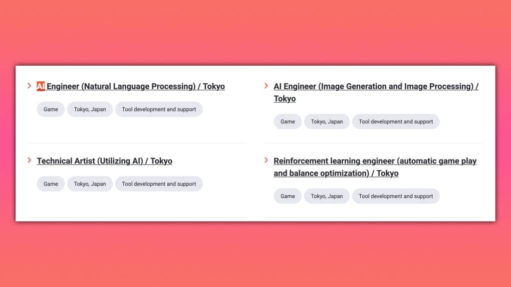 AI engineers are being hired to work on “image generation and image processing,” as well as a post looking for a technical artist “utilizing AI.”