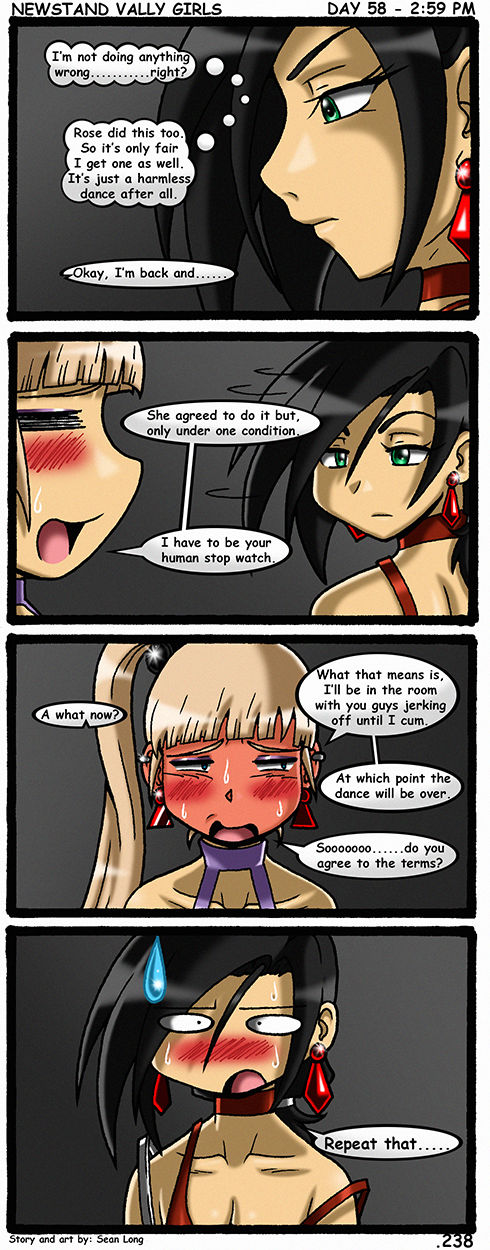 PANEL 1: [ROOM 1]Eclair: Now repeat everything I just told you.PANEL 2:Sam: I'm to only jerk off using my imagination and must keepmy eyes closed the whole time.Eclair: Right! Try to hold it in as long as you can too!The quicker you cum, the sooner my dance is over!Liz: KNOCK, KNOCK!! PANEL 3:Liz: Hello there kitten. I'm sure Sam filled you in.Anything goes here as long as the money is good.The more money you give me, the further we can take thing.Up to and including sex. But, time is up once Sam cums.PANEL 4: Liz: Understand the terms?Eclair: Yes my lady!Liz: Okay then, let's do this!Eclair: YES MY LADY!(Yes I know I misspelled some shit)All characters here belong to: MELine art by: ME(All by hand)Colored by: ME(On PS CS)NEXT: :FIRST: :https://www.deviantart.com/sseanboy23/art/NSVG-1-430837274PREV: :https://www.deviantart.com/sseanboy23/art/NSVG-238-1291296335My NSVG comics here: :https://www.deviantart.com/sseanboy23/gallery/47921604/new-nsvg