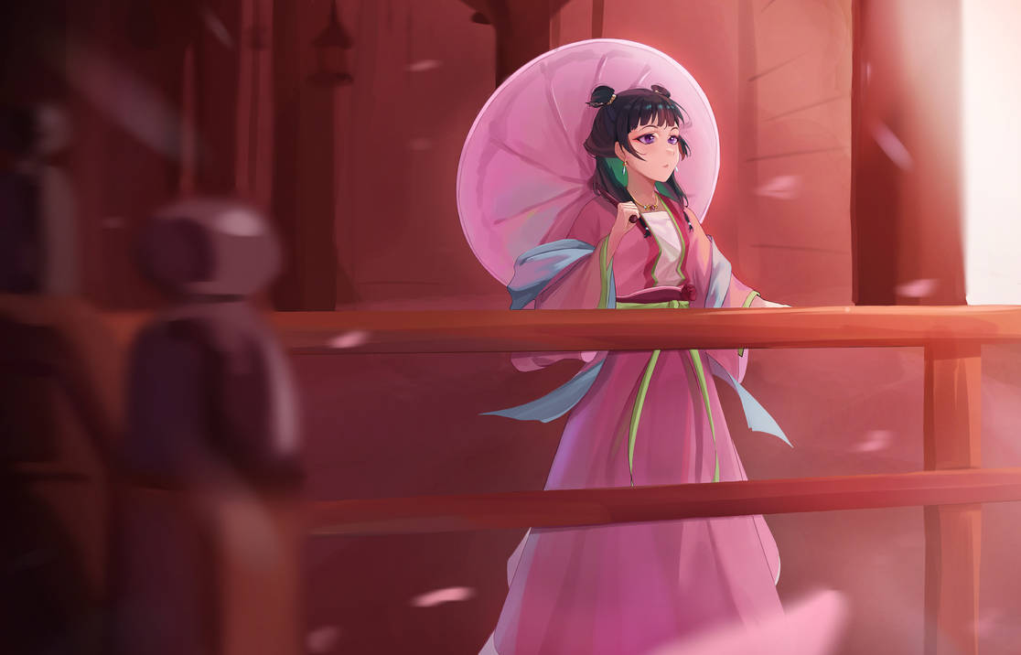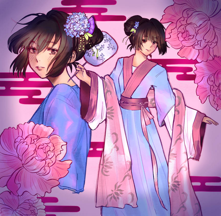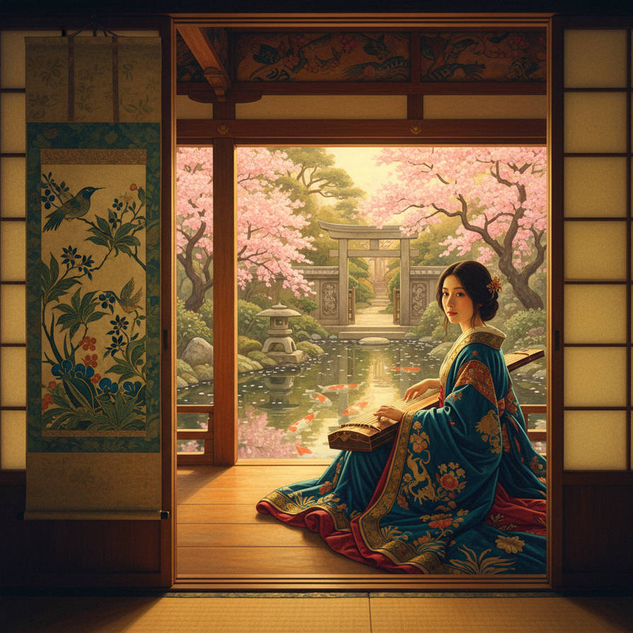 華やかな白と青の着物を纏った銀髪の美少女が、舞い散る桜の花びらと神秘的な光の中で、優雅に伝統舞踊を踊る様子を描いたアニメスタイルのイラストです。
