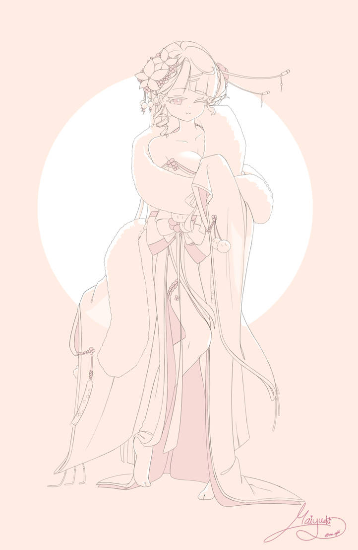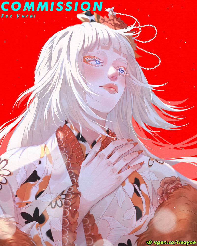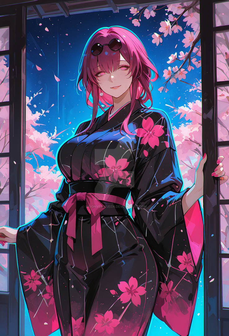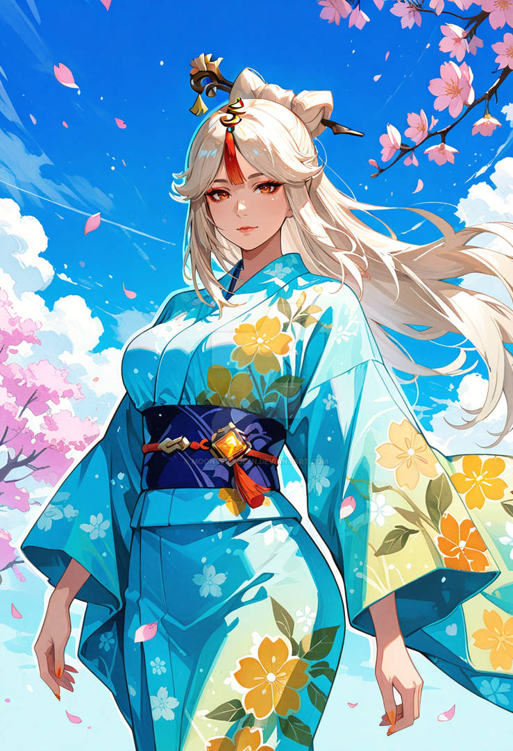 This anime-style illustration depicts a beautiful silver-haired girl in a gorgeous white and blue kimono, performing an elegant traditional dance amidst fluttering cherry blossom petals and mystical light.