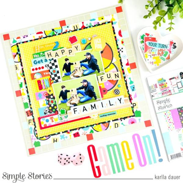 Karlla’s fun layout is filled with papers and embellishment with takes on classic board games, perfect for capturing moments of playing together. I love how she used Scrabble tile letters to spell out her title and subtitles! She also included brads and stitching for texture and dimension. Learn more at the Simple Stories blog.