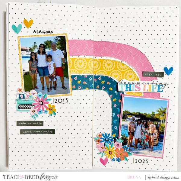 I love Bruna’s idea of taking family vacation photos 10 years apart and connecting them with a rainbow, so sweet! She created her layout with pattern paper arches for the rainbow, adding the photos and floral clusters at each end, then split it in half to fit over two smaller pages. Learn more about this asymmetrical page over on the Traci Reed Designs blog.