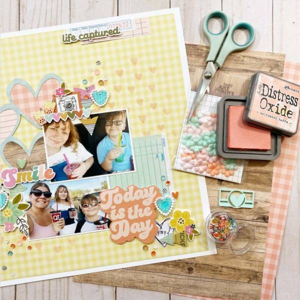 Don’t forget to document the every day family fun of getting together even just to run out and grab an ice cream or treats. This design has pastel colors, with chipboard shapes, flowers, die cut hearts backed with pattern papers, scatters of sequins and fabric hearts. I came across this layout on the Not Just for the Boys Kit Club Instagram page.