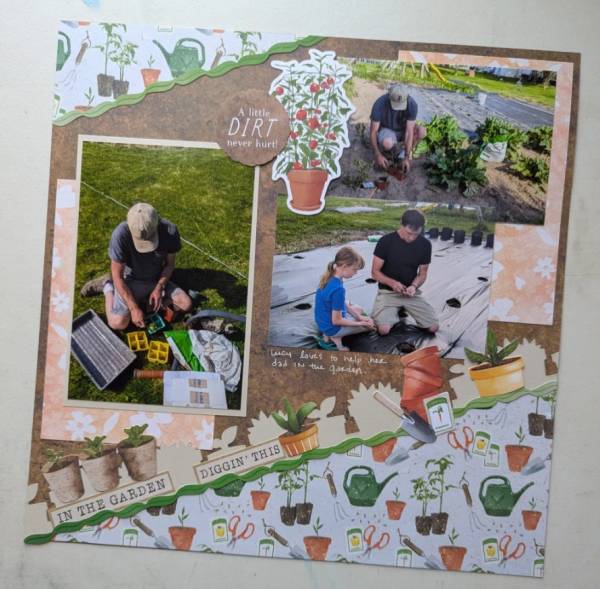 If your family loves to garden together then check out this wonderful design from Ashley. She added gardening pattern papers on two corners over brown paper that gives the feeling of dirt. There’s vines at the edges and rows of pots with sentiments along the lower corner as well. Find a link to her process video at the Scrappy and I Know It blog.
