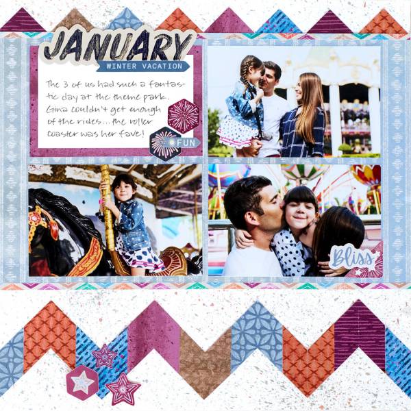 A cheerful family trip to the fair is the focus of Krislyn’s layout. She created her own amazing border with strips of folded double sided pattern papers to create chevron shapes, placed together to form a zig zag line. The same papers make a simpler triangle border up top too. There’s 3 photos and a journaling card on the center grid design with firework embellishment and a month sticker. Find directions at the Creative Memories blog.