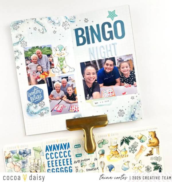 Taina’s Traveler’s Notebook pages document the fun of a winter BINGO night. She used snowflake papers for the background, die cut and stick letters for her title and included clusters of printed dies, rub-ons and chipboard shapes around the photos. Take a closer look at the Cocoa Daisy blog.