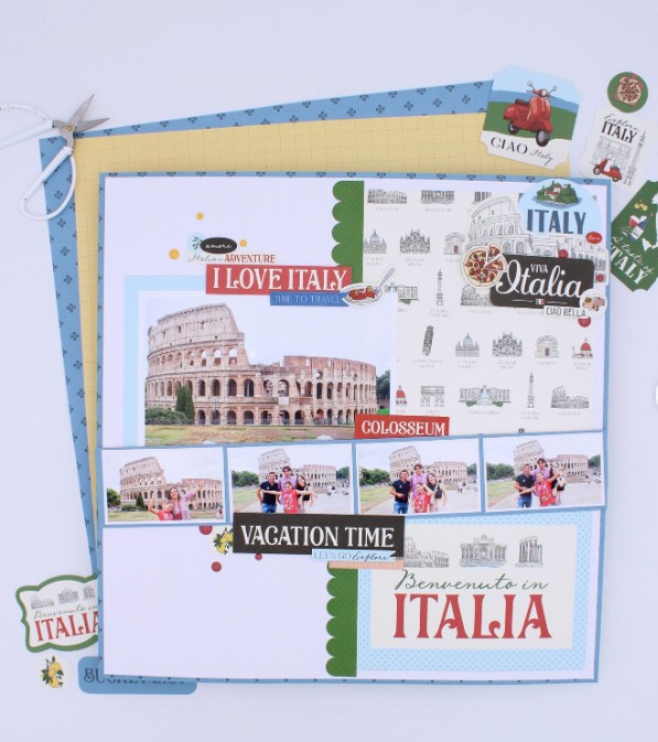 An amazing family trip to Italy uses Italian inspired products like journaling cards, pattern paper and stickers. I love the style of this layout with one large photo balanced on the opposite corner by a printed card with a photo strip across the center for 4 additional photos with of course some pasta and pizza stickers. I came across this idea on the Echo Park Paper Instagram page.
