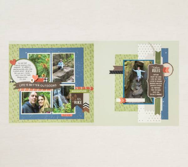 This family had fun hiking through the woods in a layout that used lots of blues and greens with touches of woodgrain papers. There’s pops of orange too with lots of cool outdoorsy sayings, many strips of papers and a circle for journaling. One side of this double page layout has a grid of 4 photos and the other has one large pic as the focal point. Take a closer peek on the Stampin’ Up blog.