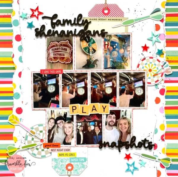 Wendy’s family night out for a game of darts layout has bold bright colors and patterns with cool dart boards and darts embellishments. There are torn pattern papers for side borders, a couple of tied tags, sentiment strips and lots of thick acrylic words and stars for depth and dimension. Learn more at the Bramble Fox blog.