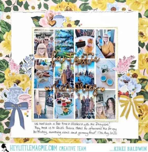 My family loves going out to eat together and I always try to take pics of us and of course all the yummy food. Kirei’s page captures a birthday lunch with a large grid of photos in the center, florals and bows at the sides, written journaling below and a background of yellow flower pattern paper. Notice how she adhered the wooden title over top of the photos, it really draws the eye in. Watch her process video at the Hey Little Magpie blog.
