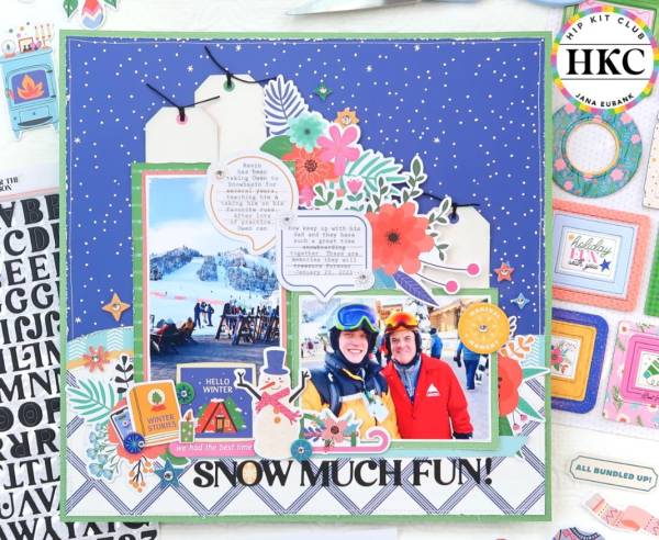 I love the juxtaposition of flowers and snowy images on this ski trip layout from Jana! She created a snowy hill and sky with pattern papers for the background and added lots of clusters around the photos including some tucked in tags. The quote bubbles are fun for journaling spaces as well! She breaks it all down at the Jana Eubank blog.