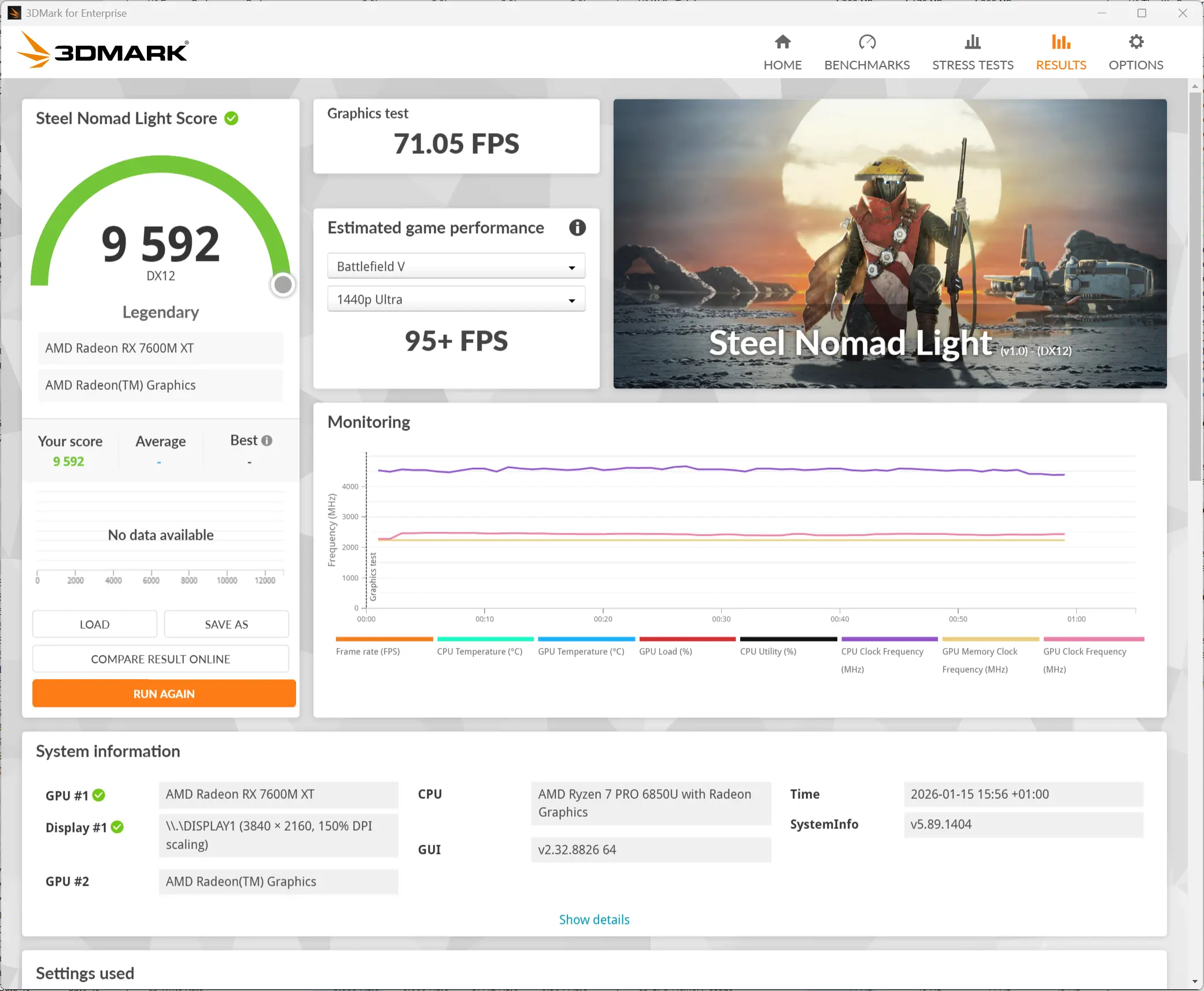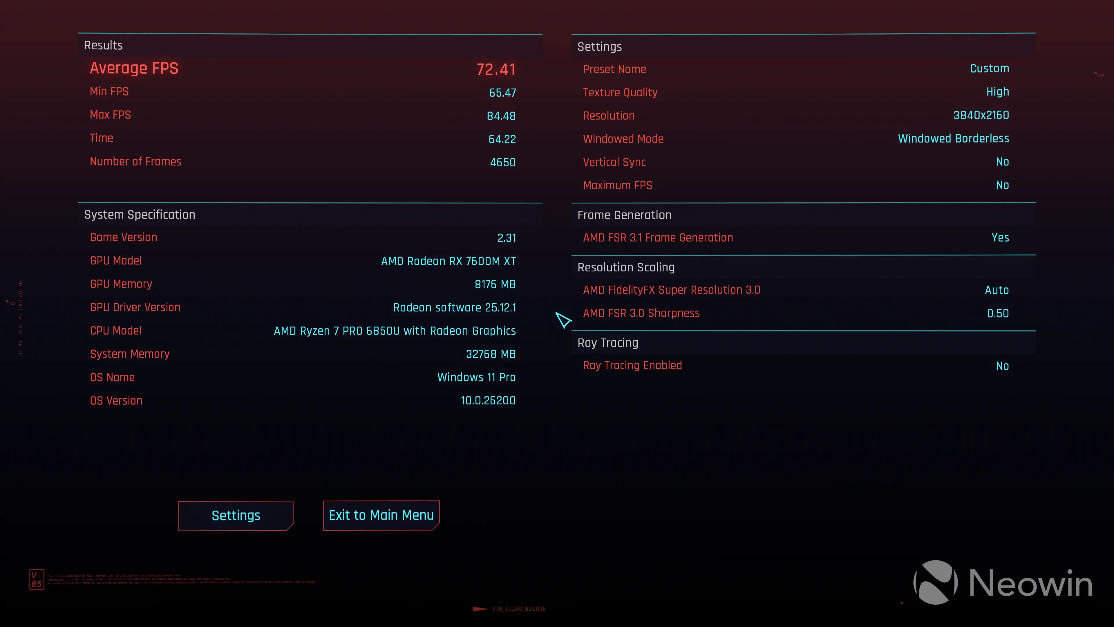 So I turned the settings down, disabling Ray Tracing, but bumping to FSR 3.1 and keeping everything else at default and ended up with a very playable average fps of 72.41.