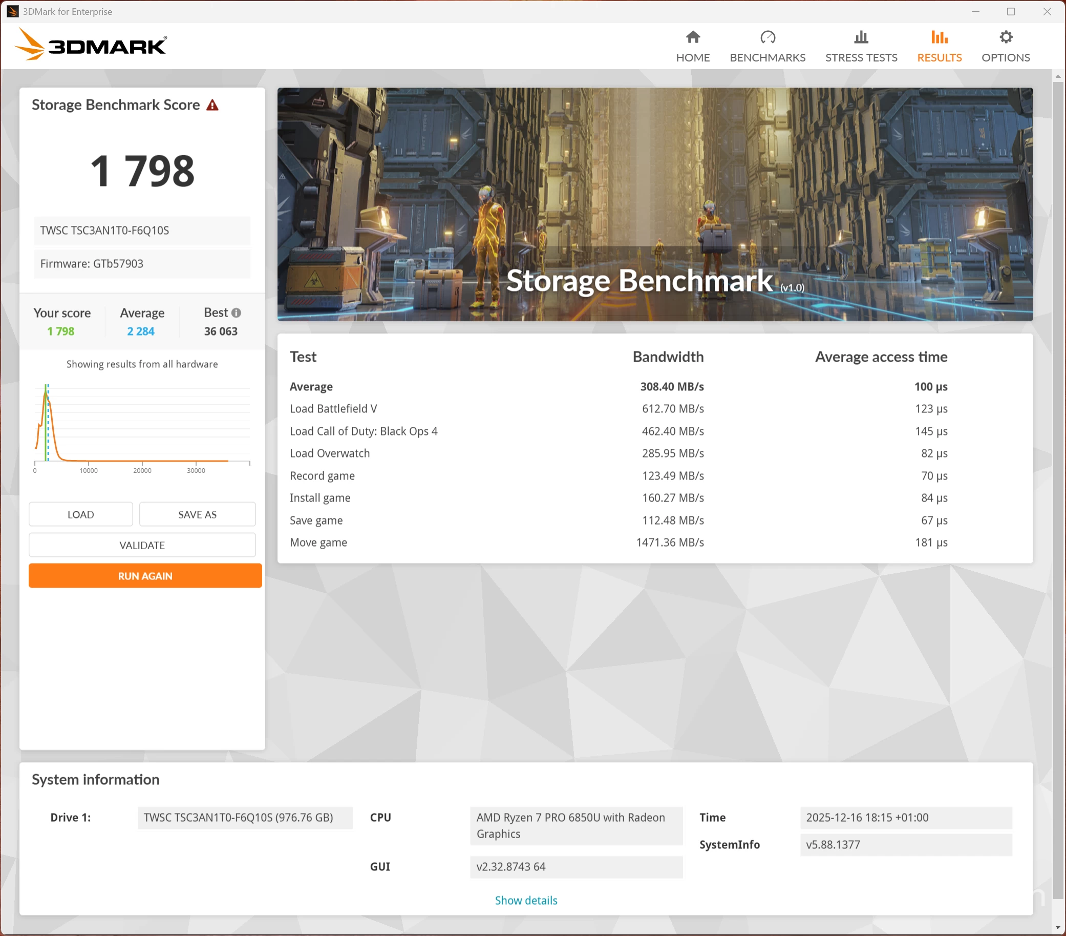 Next, I ran the Storage Benchmark, which is a component test that measures the performance of the TWSC SSD, particularly for gaming, using real-world gaming-related activities like loading games and recording gameplay. As you can see, although we gain 81 points with the AD-GP1 attached, this SSD falls well below the average of all those tested.