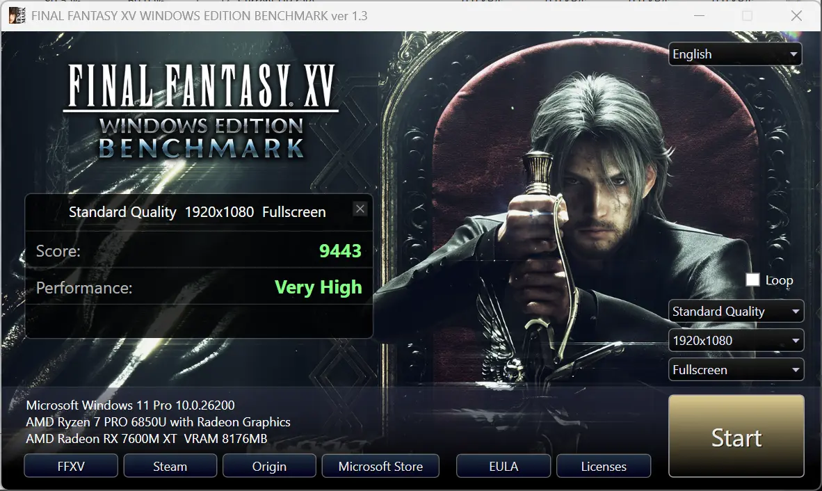 To gauge the capability of the 32CU Radeon 7600M XT, I ran the standalone Final Fantasy XV Windows Edition Benchmark on different resolutions at the Standard Quality preset to see what kind of gaming performance one can expect from the onboard GPU.