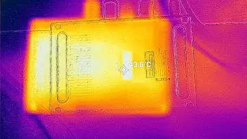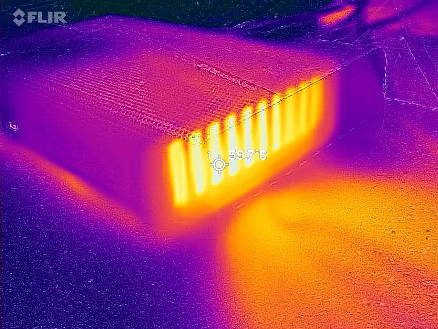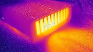 Top BottomRegarding heat, most of it is pushed out the right side, which also has the largest grill openings on the AD-GP1. I measured 59.7°C using my FLIR ONE Gen 3 thermal camera pointed at a hot spot while running a 3DMark Fire Strike test. The top of the AD-GP1 acts as an intake, while on the bottom, the hottest point was behind the serial number sticker at 43.6°C, but mostly uniform across the whole plate, which suggests to me that the AD-GP1 could have benefited from slightly higher rubber pad standoffs.