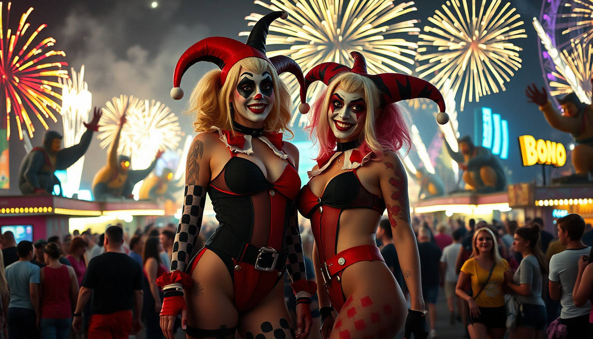 Prompt:Live action image of Poison Ivy (From DC Comics) and 1970's Harley Quinn in a seedy pool hall. At the billiard table, Poison Ivy lines up her shot, aiming her cue stick at the cue ball. Harley is leaning against a juke box.created withCreate your own AI artGet 10 free prompts every week!