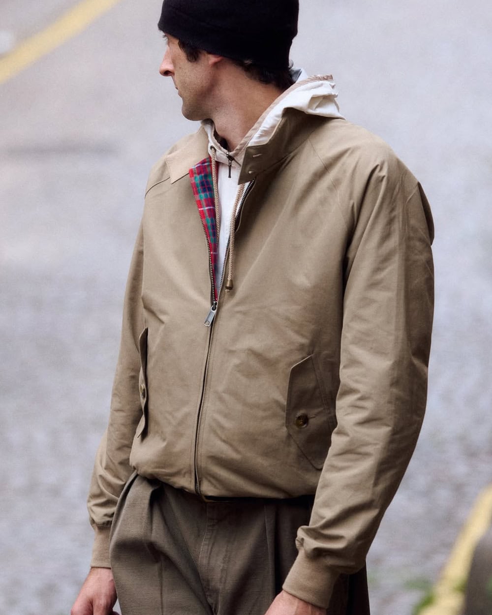 The original template comes from the Baracuta G9, introduced in the 1930s. That one detail that people always mention – the Fraser tartan lining – isn’t just decoration, it’s branding that has been reworked and imitated again and again over the years. The umbrella yoke across the back is another signature feature that helps shed rain.