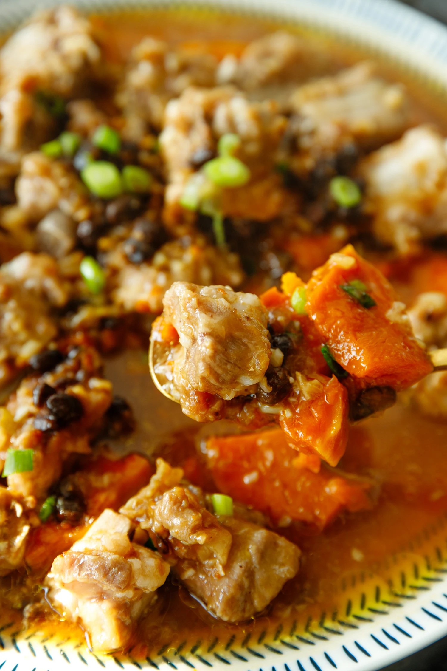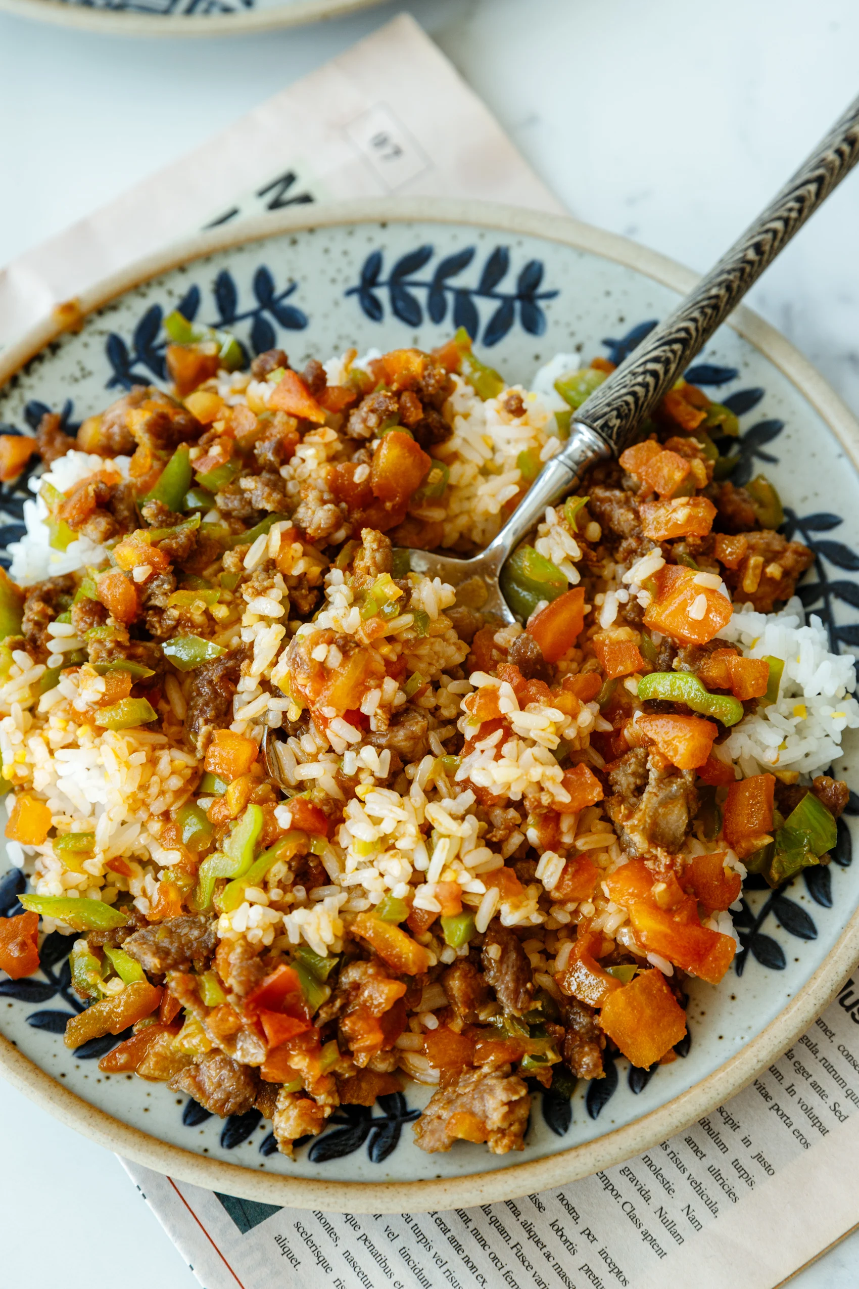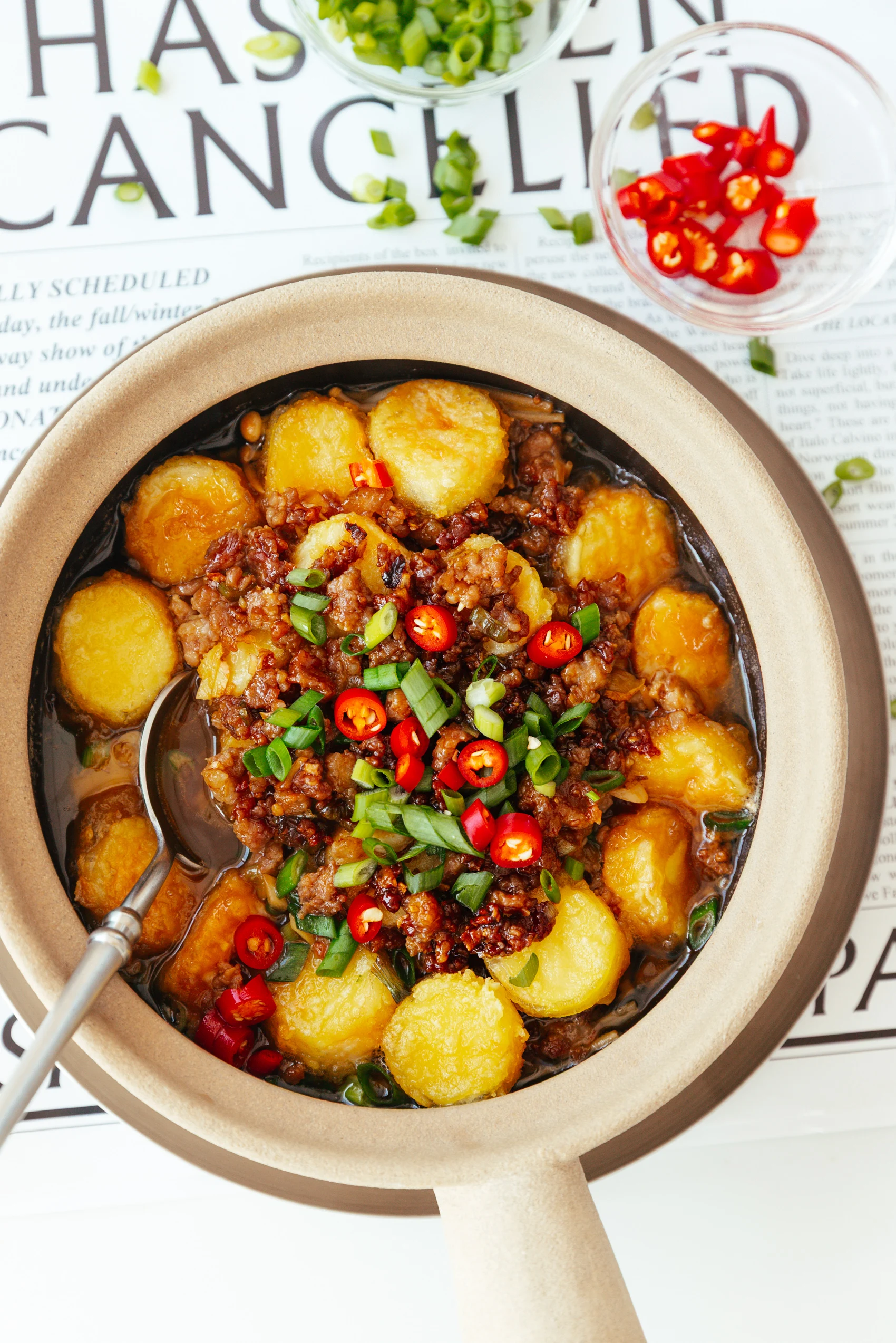 After pan-frying, there might be too much residual oil in the pan; scoop out the excess, leaving around 2 tablespoons of oil, to ensure the final dish is not greasy. I also wipe away the burnt starch fall-offs with a kitchen paper.