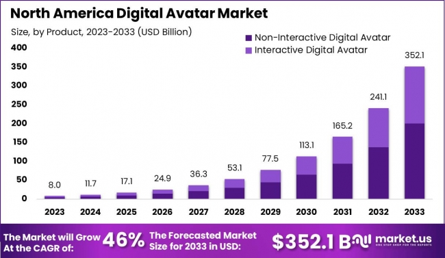 The North America Digital Avatar Market size is expected to be worth around USD 352.1 Billion By 2033, from USD 8.0 Billion in 2023, growing at a CAGR of 46% during the forecast period from 2024 to 2033.