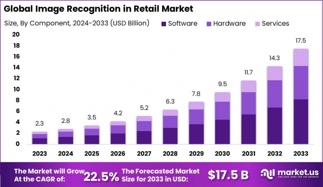 The Global Image Recognition in Retail Market size is expected to be worth around USD 17.5 Billion By 2033, from USD 2.3 Billion in 2023, growing at a CAGR of 22.5% during the forecast period from 2024 to 2033.