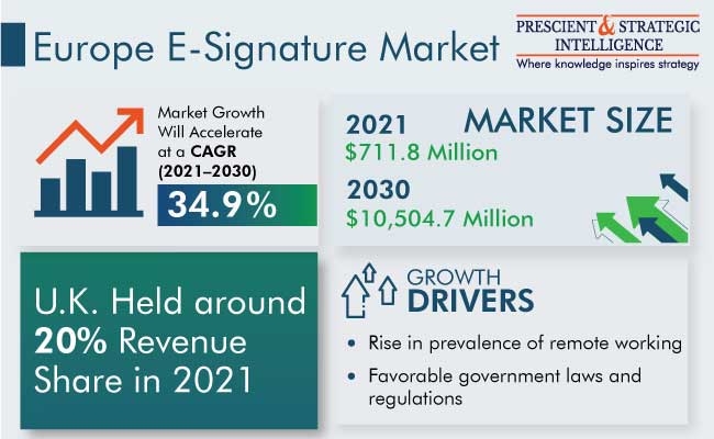 According to P&S Intelligence, the European e-signature market was valued at $711.8 million in 2021, and it is set to reach $10,504.7 million by 2030, growing at a CAGR of 34.9% between 2021 and 2030.