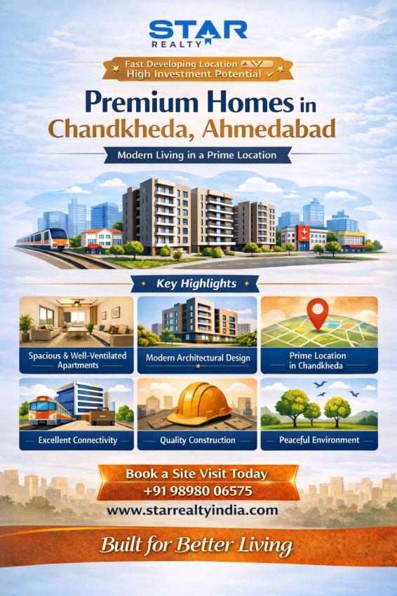 With a strong presence in the Ahmedabad real estate market, Star Realty India continues to deliver residential projects in Chandkheda that offer modern living spaces, dependable construction, and excellent location advantages, making them valuable investments and comfortable places to call home.