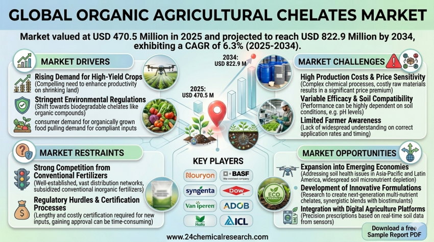 The global Organic Agricultural Chelates market was valued at USD 470.5 million in 2025 and is projected to grow from USD 502.3 million in 2026 to reach USD 822.9 million by 2034,...