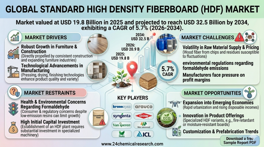 The global standard high density fiberboard market was valued at USD 19.8 billion in 2025. The market is projected to grow from USD 20.9 billion in 2026 to reach USD 32.5 billion by 2034,...