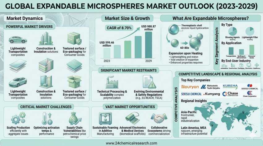 The Global Expandable Microspheres Market Size was estimated at USD 599.46 million in 2023 and is projected to reach USD 988.87 million by 2029, exhibiting a CAGR of 8.70% during the forecast...