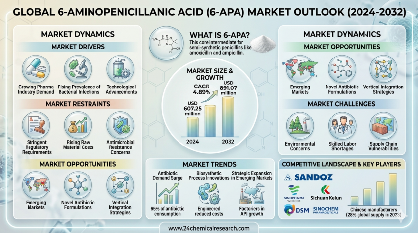 Global 6-Aminopenicillanic Acid (6-APA) market size was valued at USD 607.25 million in 2024 and is projected to reach USD 891.07 million by 2032, exhibiting a CAGR of 4.89% during the...