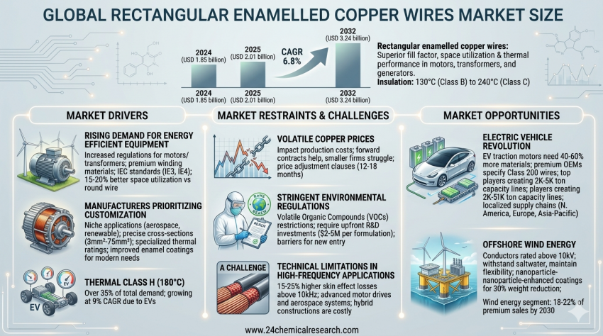 Global rectangular enamelled copper wires market size was valued at USD 1.85 billion in 2024. The market is projected to grow from USD 2.01 billion in 2025 to USD 3.24 billion by 2032,...