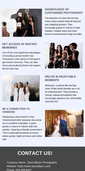 Slava Blazer Photography offers premier photo booth rentals in San Francisco, CA, ideal for weddings, corporate events, and parties. Their stylish booths are equipped with high-resolution cameras, customizable props, and instant printing options to create lasting memories. The team at Slava Blazer Photography ensures a smooth experience with professional setup and support throughout the event. Guests can enjoy unlimited photo sessions, fun digital props, and easy social media sharing. With a commitment to quality and customer satisfaction, Slava Blazer Photography's photo booths add a fun and engaging element to any occasion in the San Francisco area.