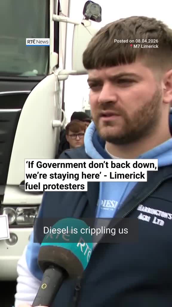 RTÉ News A fuel protest is continuing on the M7 in Limerick. Around 80 trucks and lorries were p...