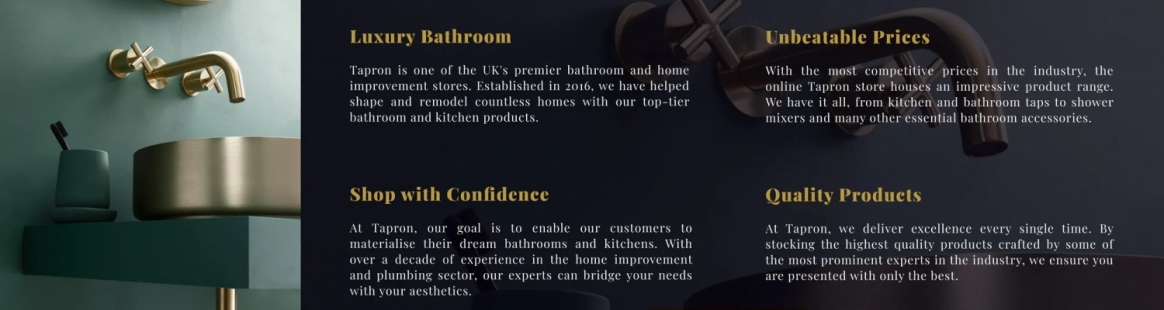 Tapron's collection of trending taps are refined with a wide selection of vogue designs fashioned to meet all your home requirements. With a wide range of products, we offer only the choicest pick through a mixture of deck mounted, wall mounted and floor standing taps that come in an array of brushed black, matt black, gilded gold, and polished chrome colours.