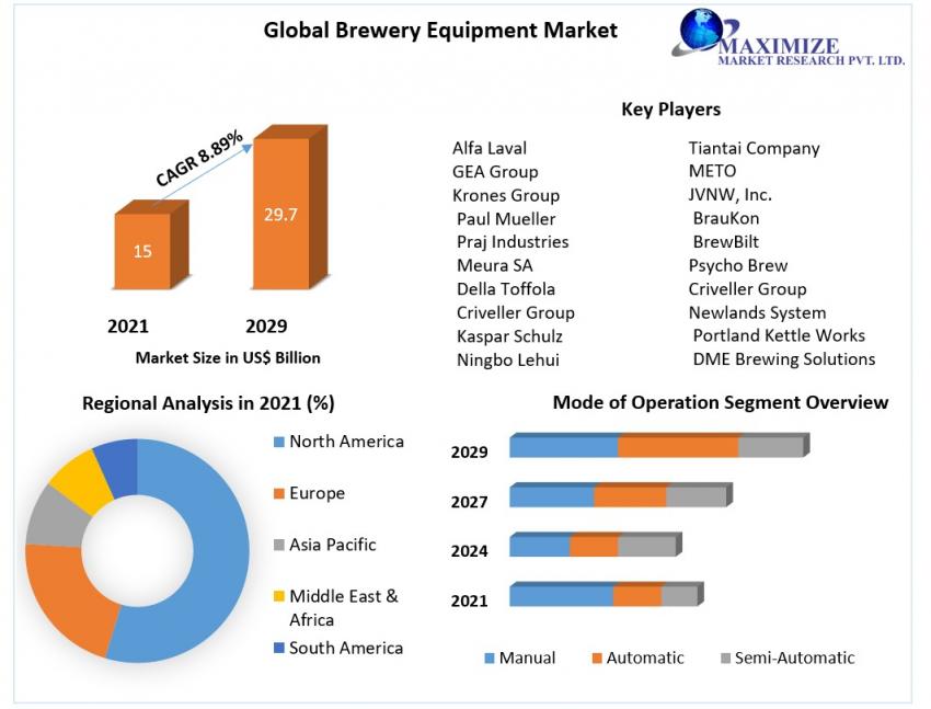 Brewery Equipment Market was valued at US$ 15 Billion in 2021 and is projected to reach US$ 29.7 Billion by 2029, growing at a CAGR of 8.89% during the forecast period. The strong expansion of...